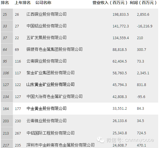 《财富》(中文版)于北京时间2015年7月8日发布今年的中国500强排行榜,榜上前三名的位次保持不变,中石化以2.8万亿元的收入成功卫冕榜首,中石油、中国建筑分列第二、第三位。所有上榜公司的总收入达到了30.4万亿元,较去年增长5%;利润达到2.7万亿元,增长6%。多家有色金属企业入围中国500强榜单,其中江西铜业股份有限公司榜单排名25名,中国铝业股份有限公司榜单排名33名,五矿发展股份有限公司榜单排名37名,位居前列。以下为上榜有色企业名单: